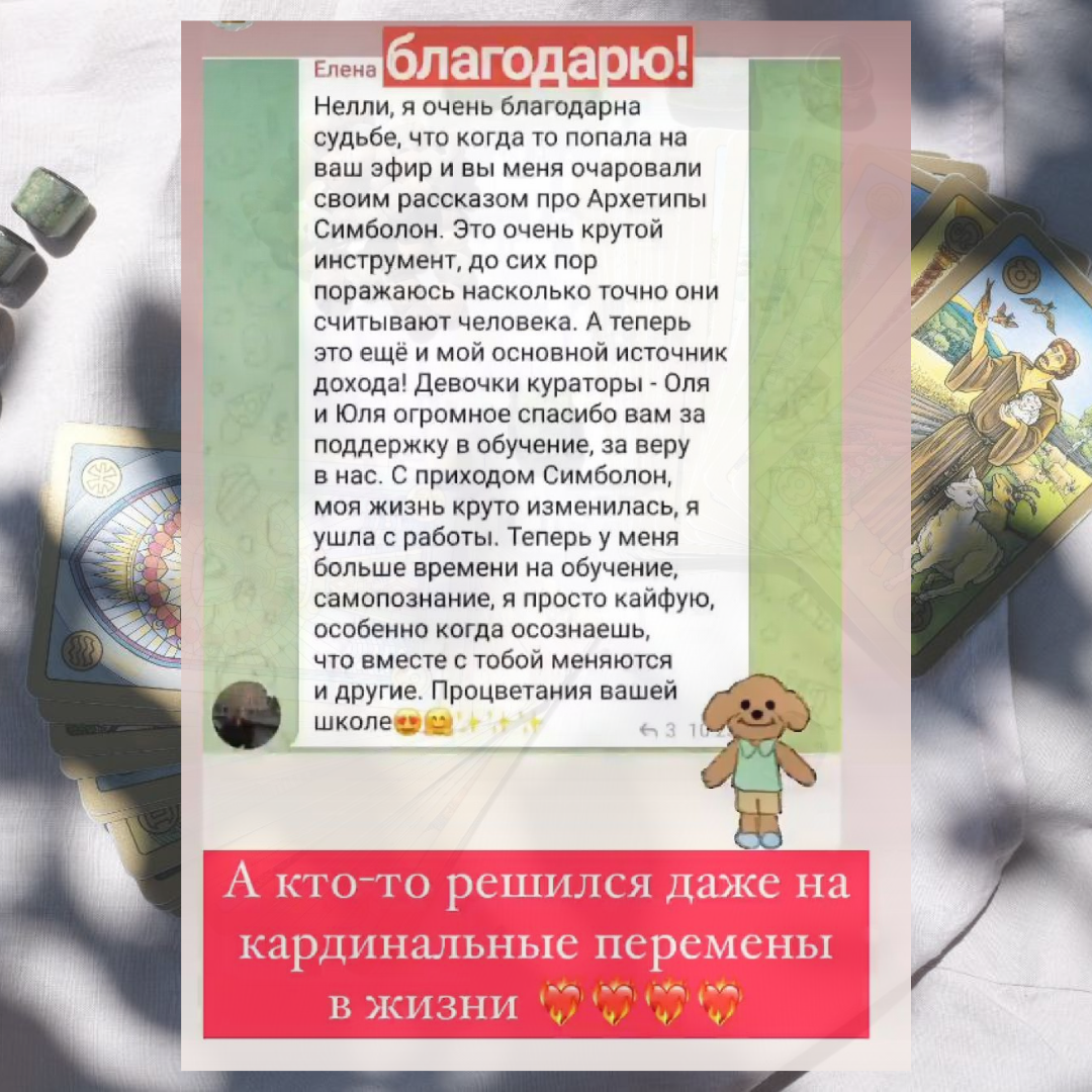 В результате обучения вы сможете быстро и легко трактовать расклады на разные темы, помогать в любых ситуациях и себе и другим и при желании зарабатывать на раскладах!